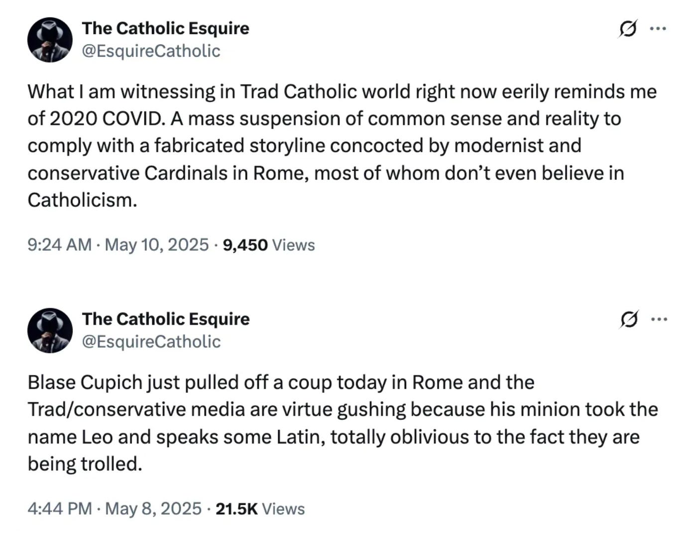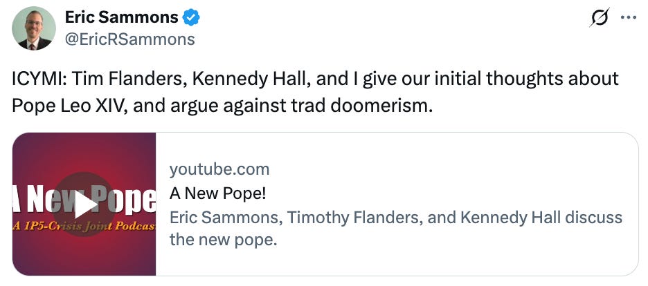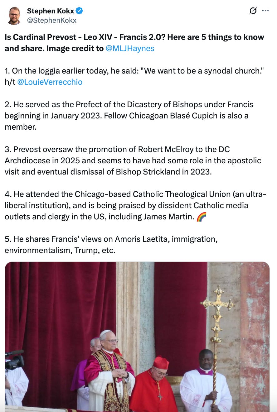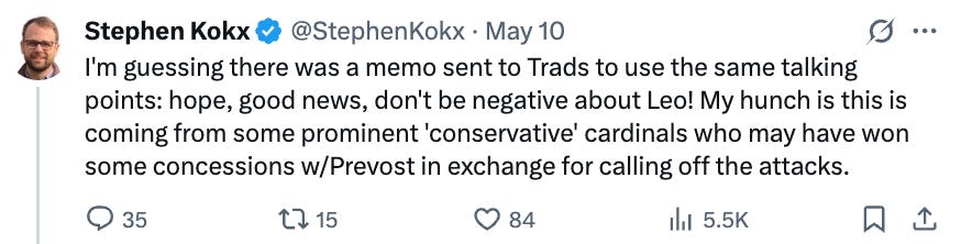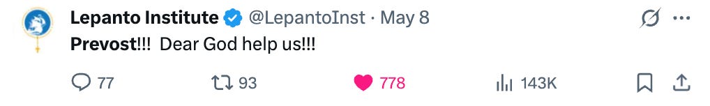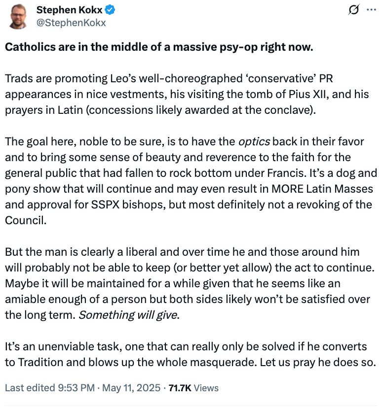 Our critics seem to be infuriated by the fact that we were sounding the alarm on Day 1 and warning Catholics to not live by the lies, half-truths, and deceptive practices Trad Inc. and Catholic Inc. were using on them. Below is another post we published after the conclave on X that exposed their scheming: