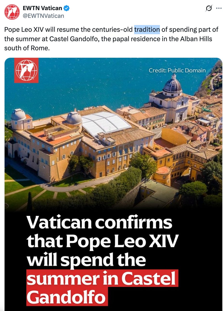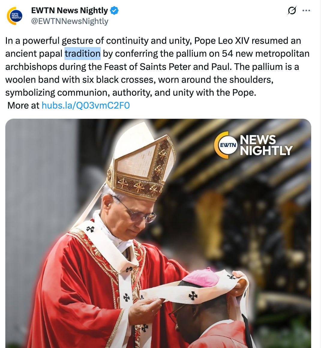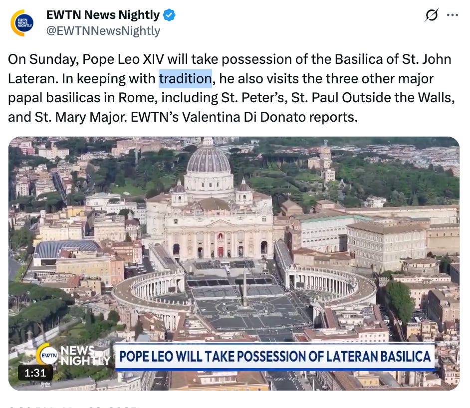 Aside from Raymond Arroyo’s occasional criticisms, EWTN has been one of the most loyal apparatchiks in the Vatican’s propaganda operation. Below are several social media posts they have published. Notice the repeated use of the word “tradition.” This is obviously part of a re-branding campaign designed to make Leo look like a defender of orthodoxy. It is also likely being done to placate wealthy conservative Catholic donors in the US who want to see the prestige of the papacy restored.