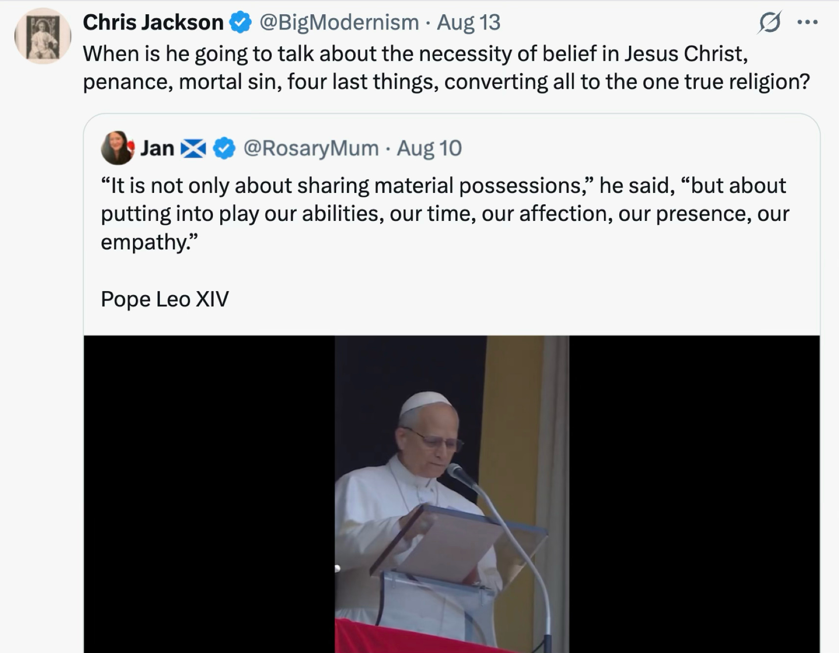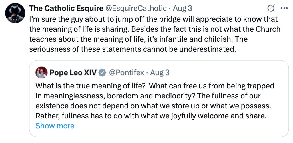 Leo talks in platitudes and generalities as if the Catholic faith is a New Age spirituality cult designed for self-improvement instead of it being the one true religion established by God. See these X posts:
